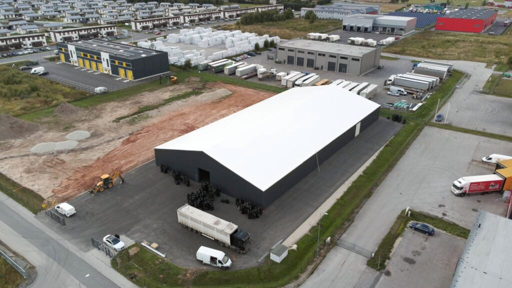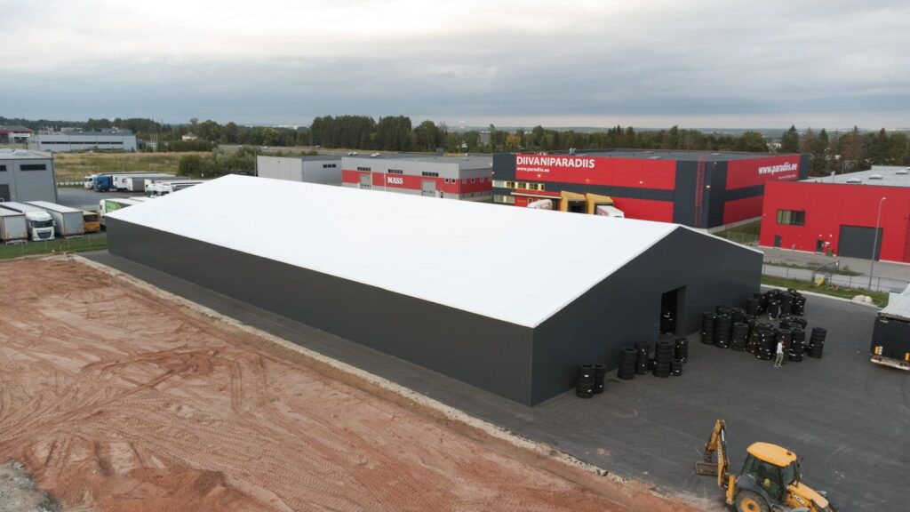 Suur PVC katusega viilhall kauba ladustamiseks.