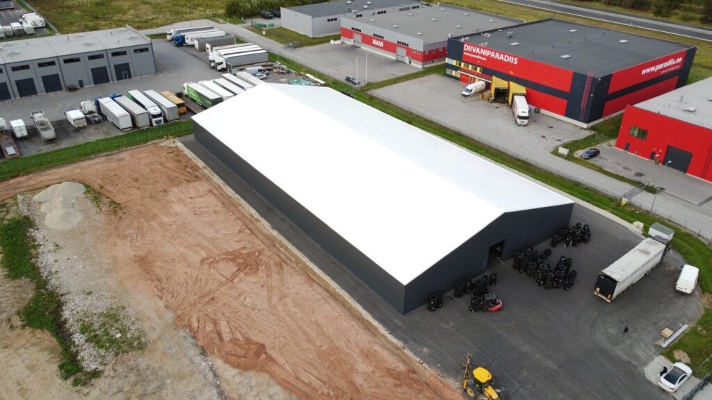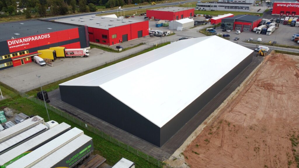 Otstarve: Suur PVC katusega viilhall kaupade ladustamiseks.